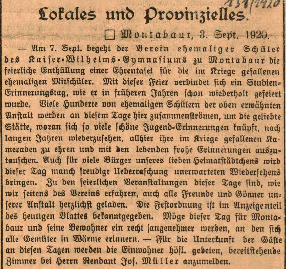 - Gedenktafel für die gefallenen Soldaten und Opfer des Nationalsozialismus des Mons-Tabor-Gymnasiums Kreisblatt für den Unterwesterwald Jg. 1920 Nr. 131