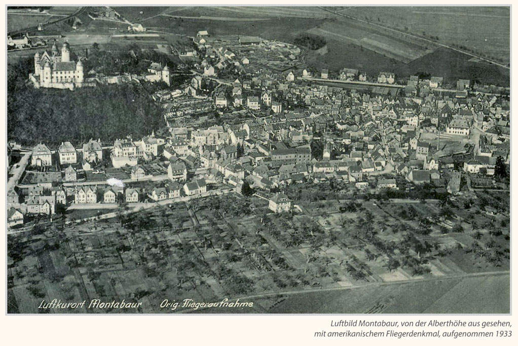Die Fliegeraufnahme aus dem Jahre 1933 zeigt im Vordergrund die Alberthöhe, die bis Anfang der 1970er Jahre ein vielgenutztes Kleingartengelände der Montabaurer Bevölkerung war. Ihren Namen führen frühe Chronisten auf den Koblenzer Ritter Albert vom Kirchhof zurück, der dort im Jahre 1212 zu Tode kam, als er einen dem Kurfürsten Dietrich II. zugedachten Schwertstreich des Grafen Heinrich von Nassau mit seinem Körper abfing.