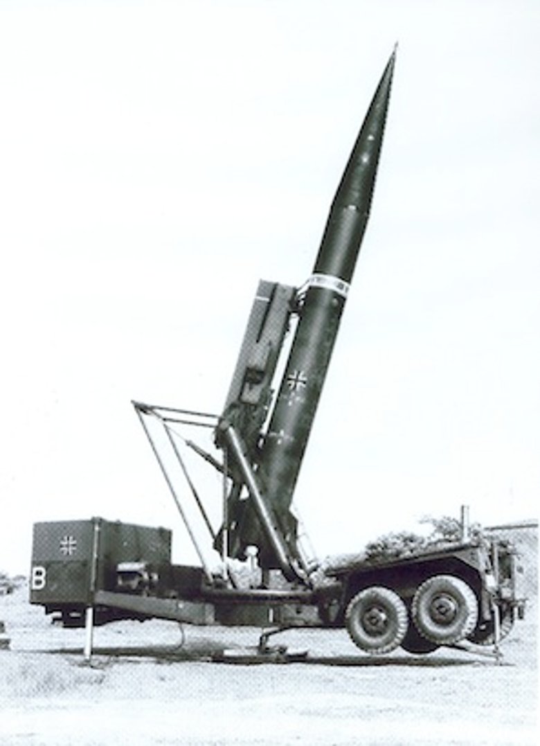 Artillerierakete "Sergeant" auf Raketenwerfer (Sattelauflieger) abschußbereit montiert.