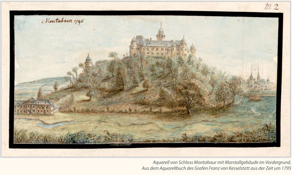Zum Schloss Montabaur hatte die Familie von Kesselstatt einen besonderen Bezug, weil die Ritter von Kesselstatt im 14. Jahrhundert als seine Vorfahren Burghauptmänner auf der damaligen Burg Montabaur waren, in kurtrierischen Diensten standen und er selbst mit dem früheren Kurfürsten Johann Hugo von Orsbeck, dem Bauherrn des hier aquarellierten Schlosses Montabaur, verwandt war.