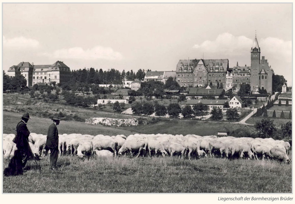 Das stimmungsvolle Foto, um das Jahr 1950 herum entstanden, zeigt das ehemalige Caritashaus der Barmherzigen Brüder, erbaut im Jahre 1861, abgebrochen Anfang der 1980er Jahre, mit anliegender Kirche. Heute steht dort das neue Krankenhaus. Links im Bild das 1910 erbaute „Collegium Marianum“, später bischöfliches Konvikt, heute Sitz der Kreisverwaltung.